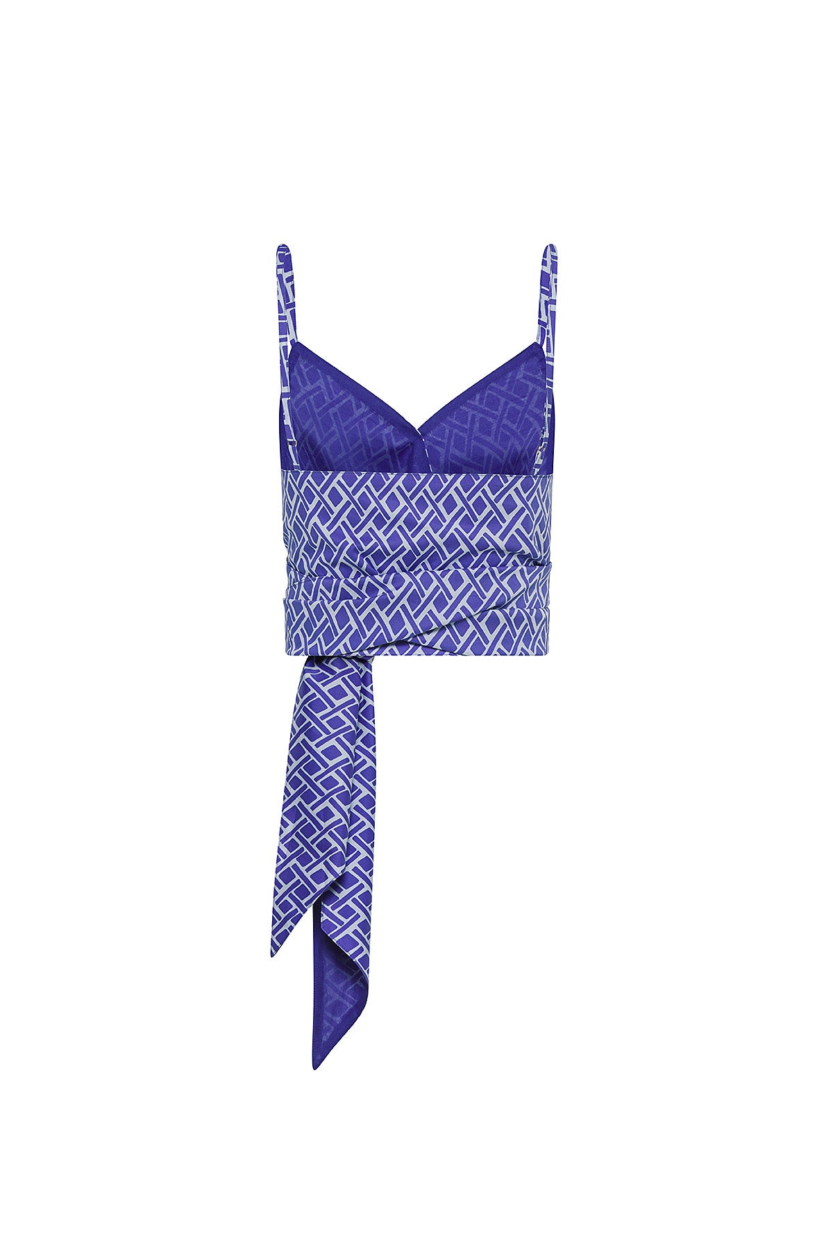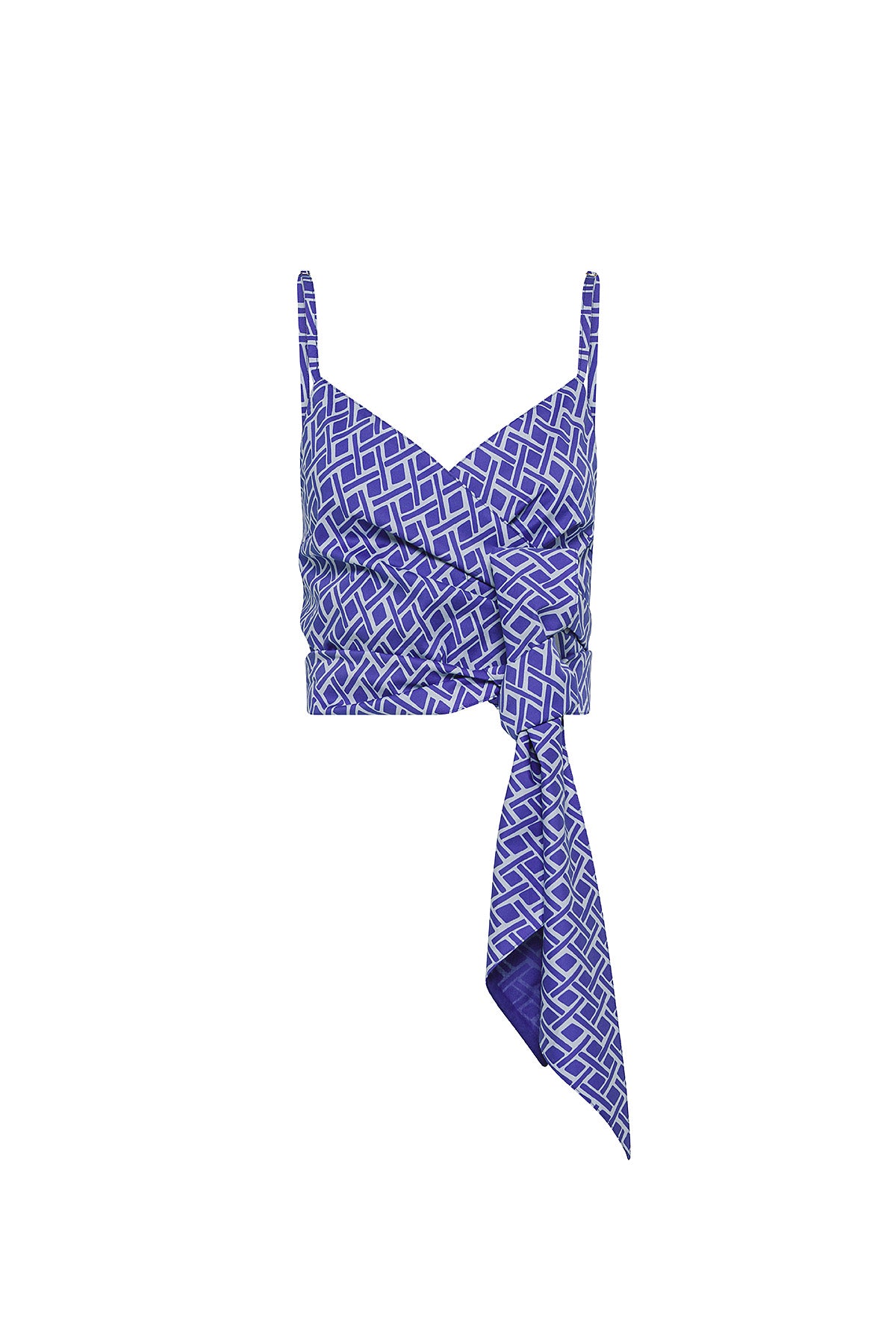 Fresco e contemporaneo, questo top è realizzato in popeline con stampa di collezione ed è caratterizzato da spalline sottili che alleggeriscono la linea. La fascia frontale consente la chiusura del capo, definendo il design con un dettaglio grafico e funzionale.