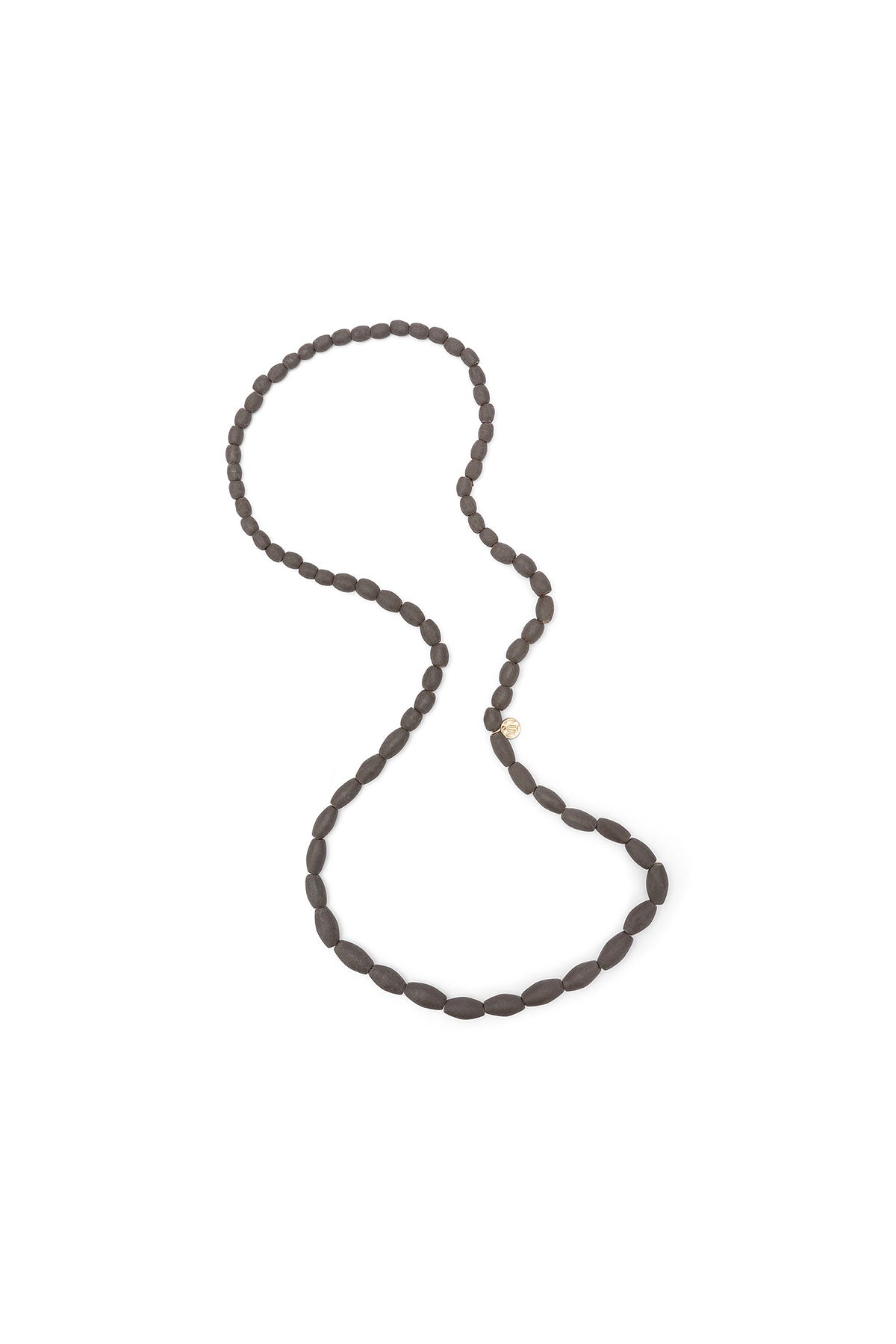 Lebendig und dekorativ, besteht diese lange Halskette aus farbigem Holz und ist mit einem goldfarbenen Logodetail versehen, das dem Design einen leuchtenden und markanten Akzent verleiht. Die minimalistischen Linien betonen den Kontrast zwischen der Textur des Holzes und der metallischen Oberfläche.