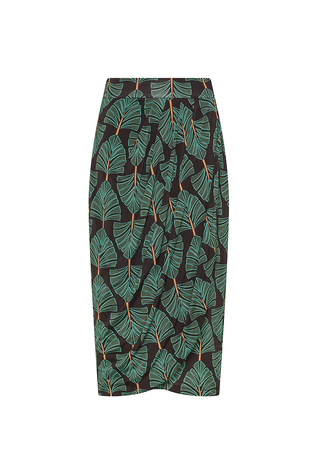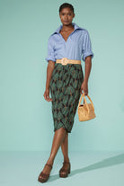 Sarong-Bleistiftrock aus bedrucktem Jersey, geprägt von einem raffinierten, umwickelnden Design. Der mittige Schlitz, der seitlich entlang der gesamten Länge des Rocks geöffnet werden kann, sorgt für einen dynamischen und femininen Effekt und betont die Bewegung auf natürliche Weise.