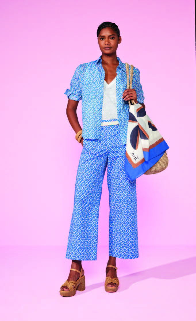 Entwickelt, um die Klarheit des Popeline-Stoffs und den Druck hervorzuheben, fügt sich die Hose mühelos in frische, schlichte Outfits ein, wobei das grafische Muster zum Blickfang des Kleidungsstücks wird.