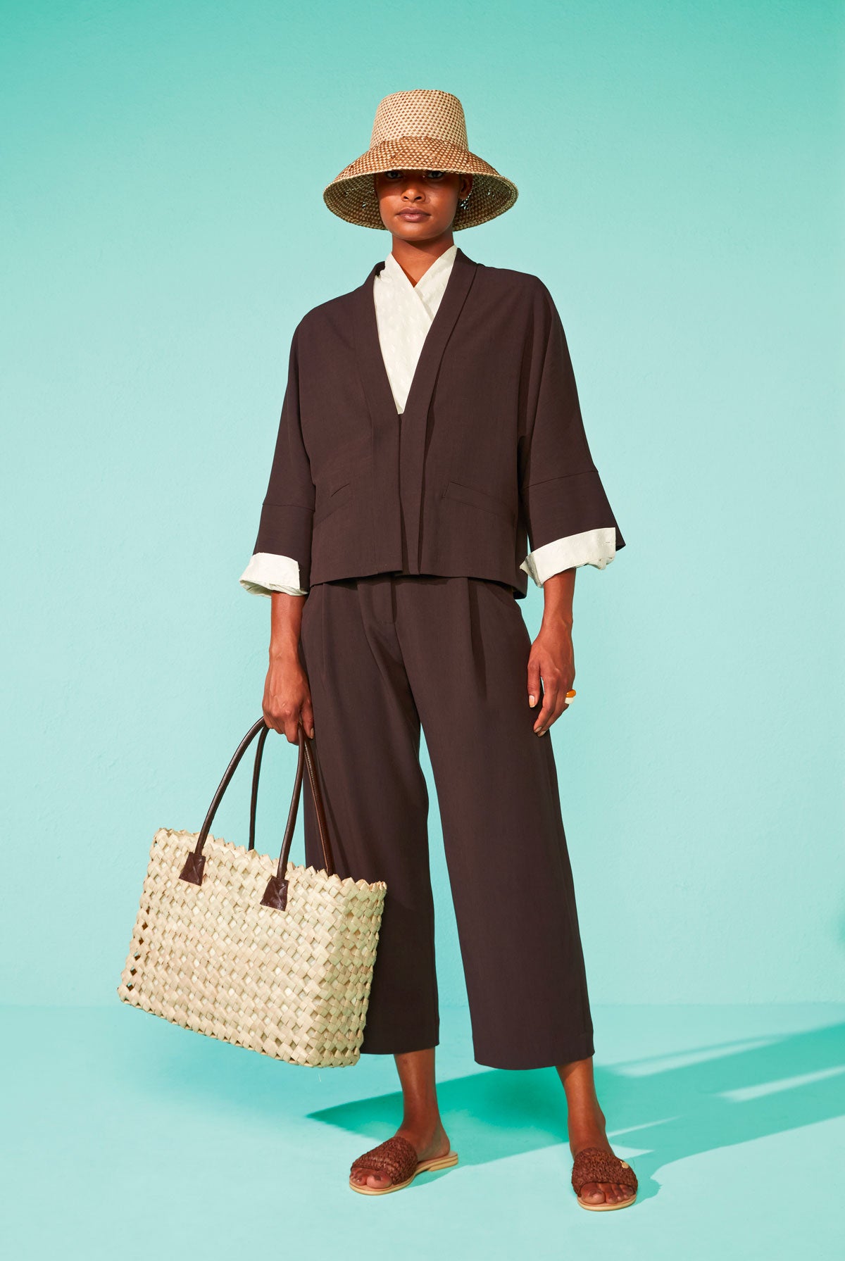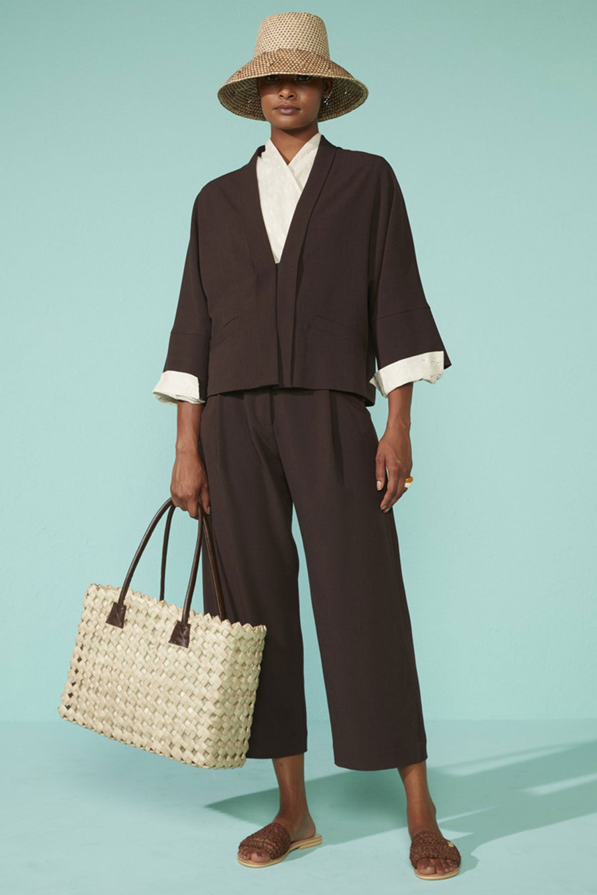 The wide, smooth handle creates an elegant contrast with the braided sisal, ensuring a comfortable grip and balanced design. Its medium proportions make it versatile and functional, perfect for complementing daytime looks with a refined yet minimalist style.