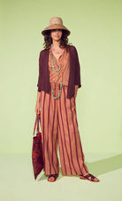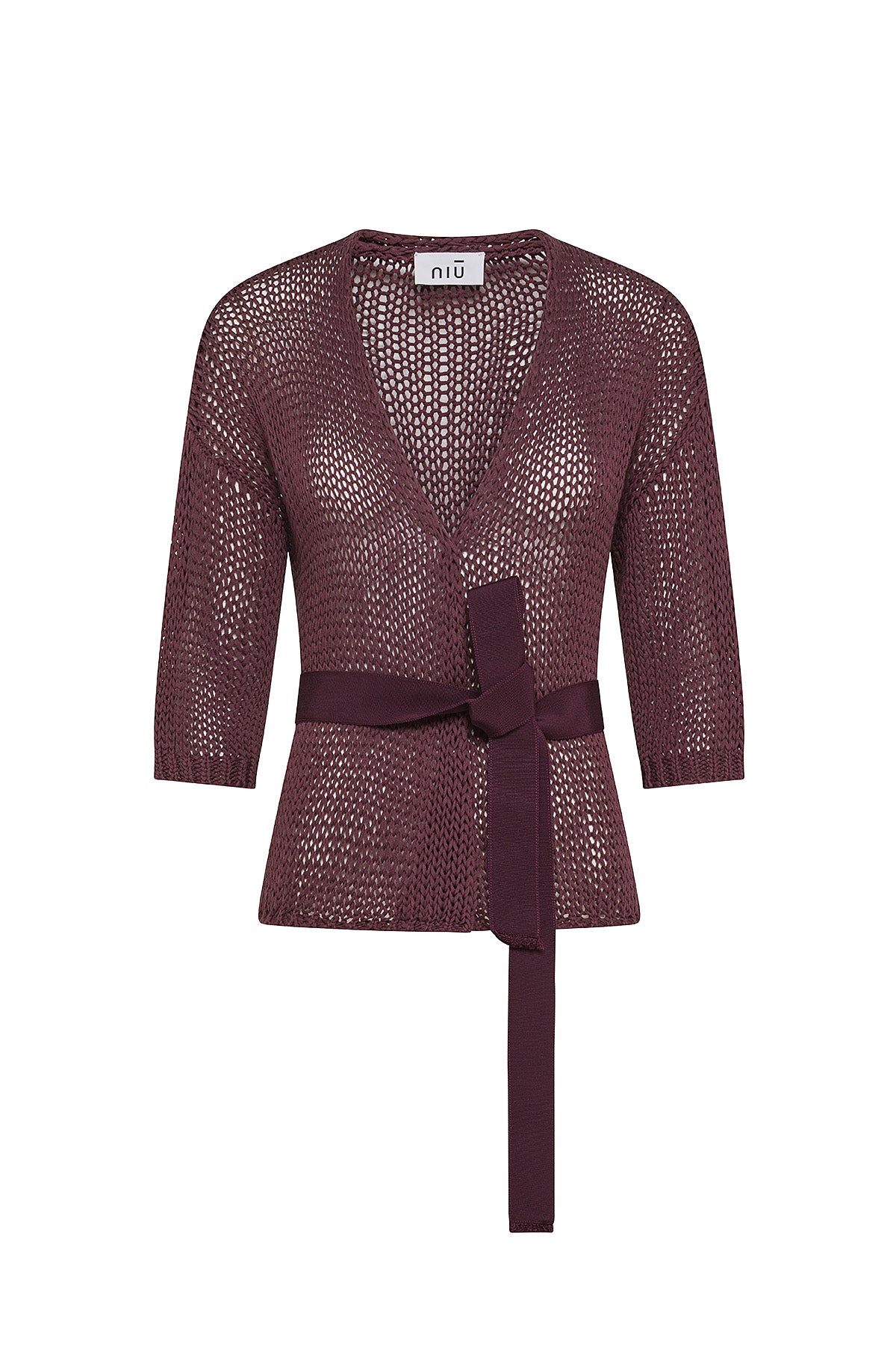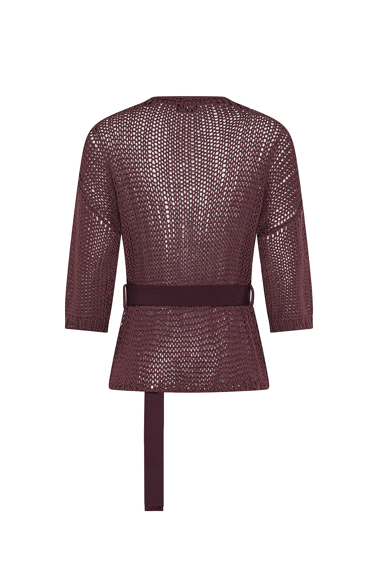 Contemporary in character, this monochrome kimono-style top is crafted from a special openwork knit that adds lightness and depth to the garment. The three-quarter sleeves are wide and soft, enhancing the relaxed silhouette of the model.