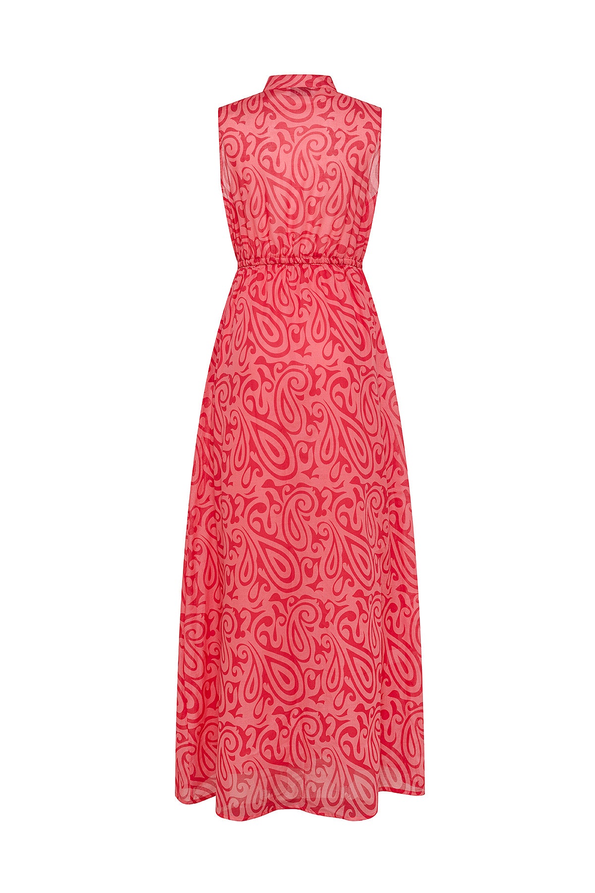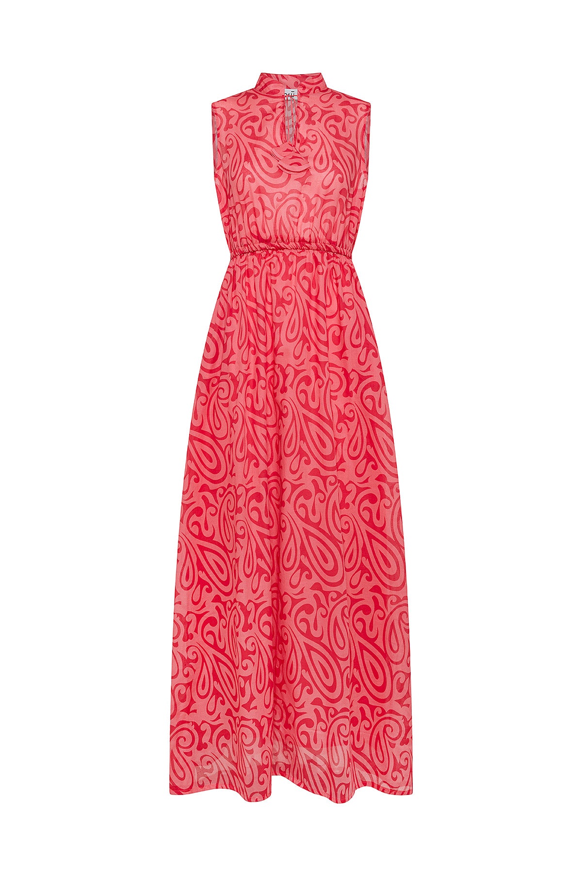 Refined and lightweight, this long sleeveless voile dress features a collection print designed to give the piece a fresh and contemporary elegance. The high neck with ties adds a delicate, feminine detail, while the elastic waist gently defines the silhouette, maintaining a fluid and comfortable fit.
