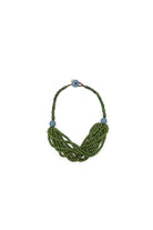 Compacto y con textura, este collar corto está realizado en madera coloreada y cuenta con un cierre de botón de madera con ojal en cordón encerado, detalle funcional que evoca una estética natural y artesanal.