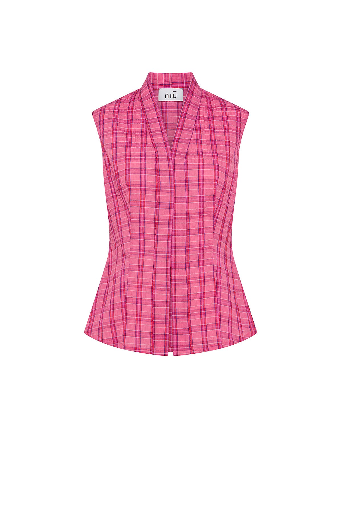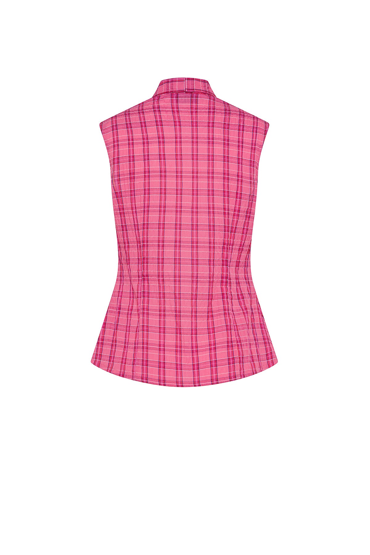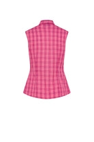 Légère et contemporaine, cette chemise sarong sans manches est réalisée en tissu léger à imprimé carreaux. Le design se caractérise par un décolleté en V et une fermeture frontale avec boutons cachés, conservant une ligne épurée et essentielle.