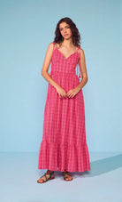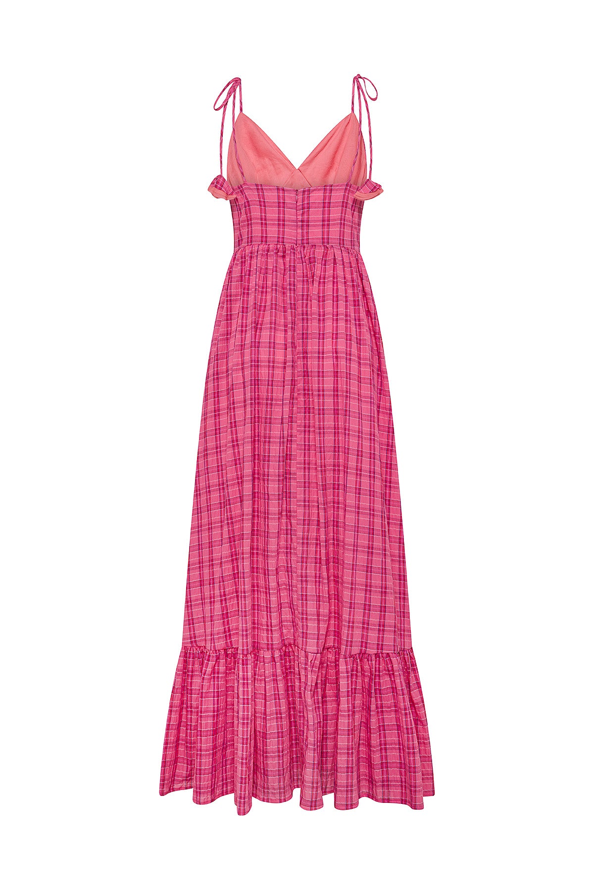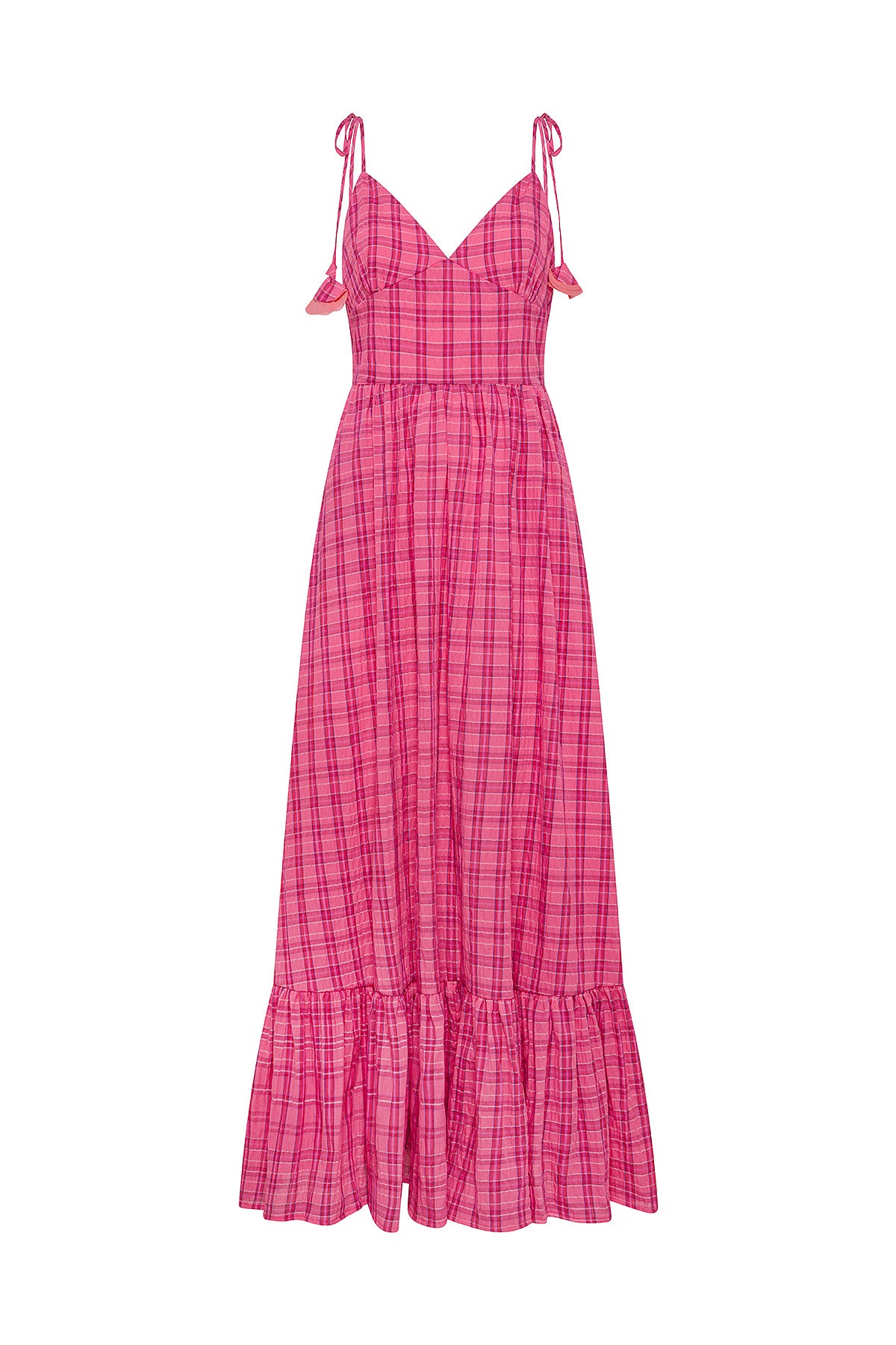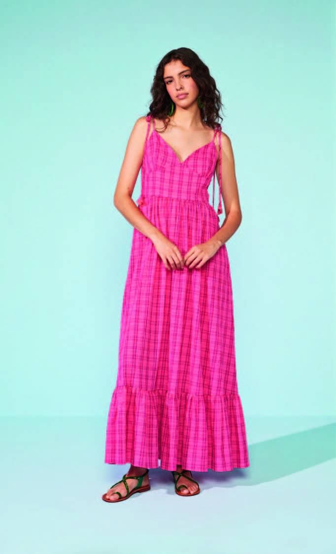 Fraîche et féminine, cette robe longue en check léger associe des détails délicats à une ligne fluide pensée pour accompagner les mouvements avec naturel. Les bretelles nouées et le col en V mettent en valeur le décolleté avec discrétion, tandis que l’ourlet évasé apporte dynamisme et légèreté à la silhouette.